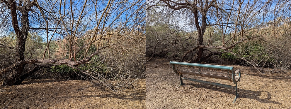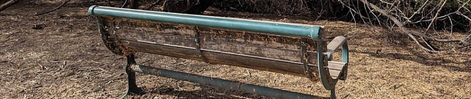 Like, maybe before the reeds and grasses growing along the completely hidden-from-view pond grew up to hide said view? Like, maybe before the tree branch/trunk bent over to fill in the eye-level vista for anyone sitting on the bench? Like, maybe. And if so, then it’s been a while since there was any view of any kind from this bench.